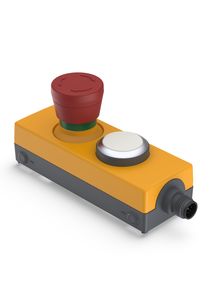 E-BOX M12, Not-Halt, Leuchtdrucktaster, Gold, M12 8-polig A-kodiert, Rückstellung durch Drehen, beleuchtbar