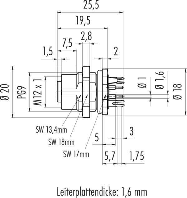 Polzahl: 4, schirmbar, tauchlöten, IP68, UL, PG9