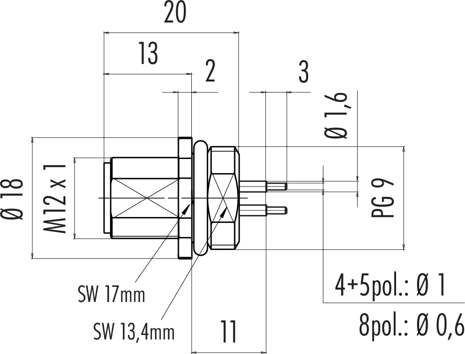 Polzahl: 5, nicht geschirmt, tauchlöten, IP68, UL, M16x1,5