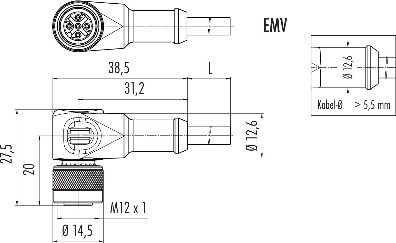 Polzahl: 5, geschirmt, crimpen, am Kabel angespritzt, IP67, UL listed, Geschirmtes Kabel, PVC Kabel grau, 5 x 0,25 mm²