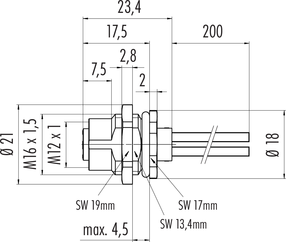 Polzahl: 4, nicht schirmbar, Litzen, IP68, UL, VDE, M16x1,5