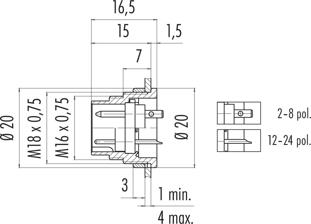 Polzahl: 3 DIN, nicht schirmbar, löten, IP40