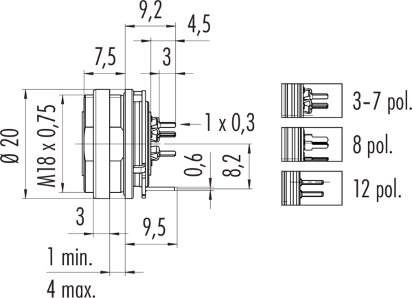 Polzahl: 8 DIN, schirmbar, tauchlöten, IP67